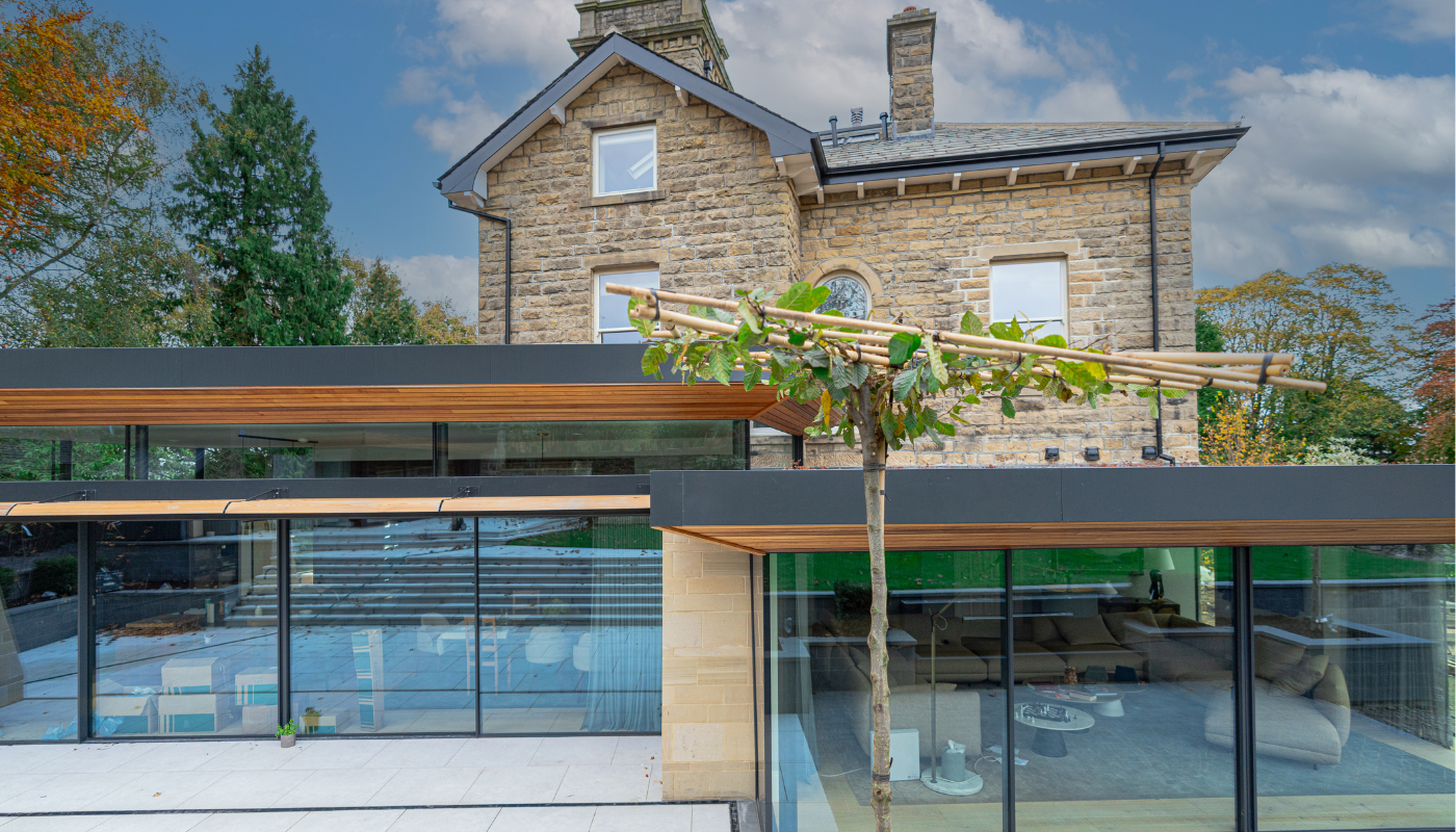 Given the stunning views from the site and the desire to merge interior and exterior spaces, the large sliding doors in Ilkley in Ral 7021 Matt became a natural solution, and key design feature to the rear of the property which overlooks the garden.