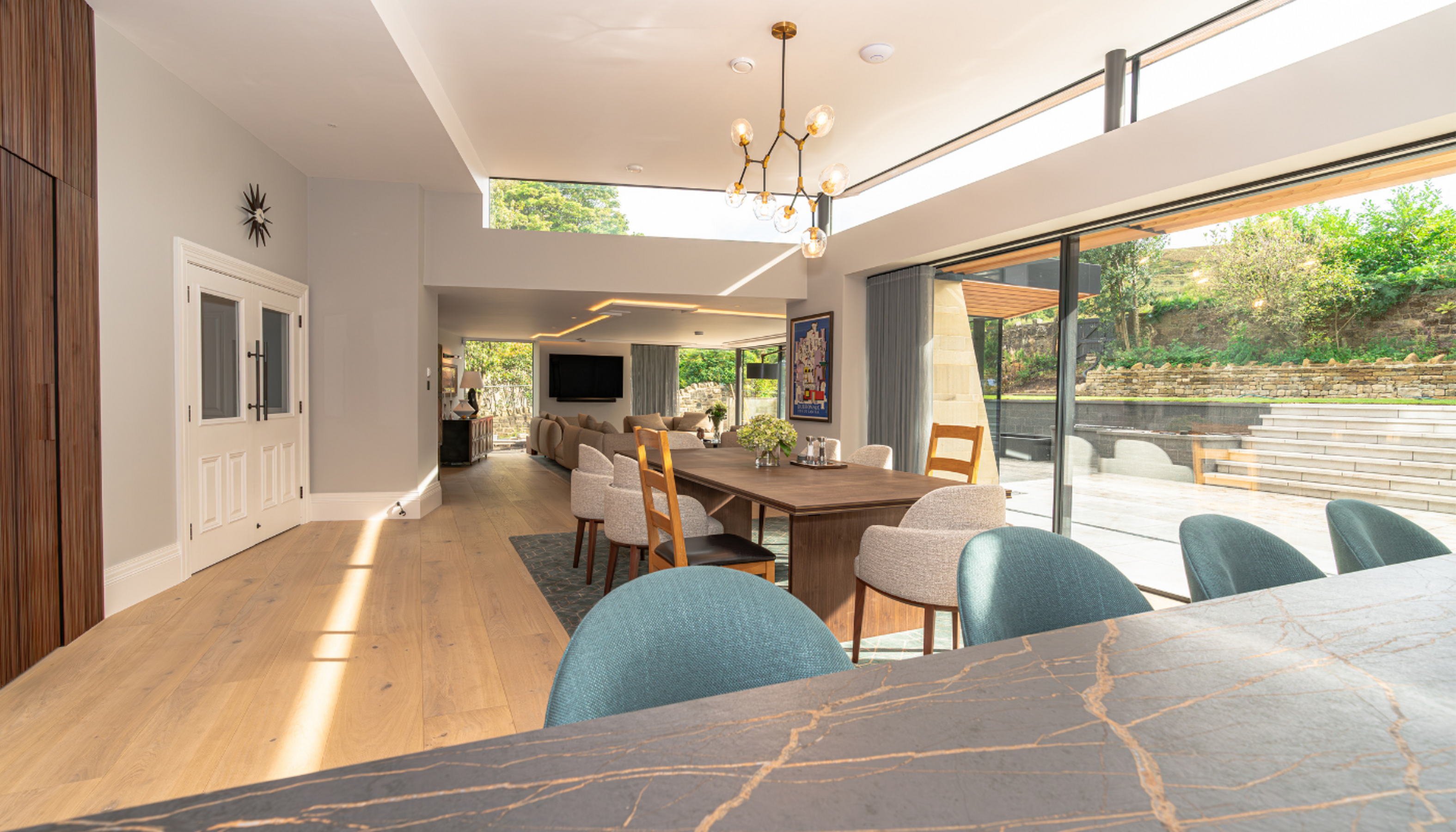 Perched on the edge of Ilkley Moor in West Yorkshire,is a stunning Victorian property overlooking the Whafe Vallet. Its elevated setting provides sweeping views out to the moorland and beyond, a striking example of how modern glazing can transform a relationship between architecture and landscape with large sliding doors.