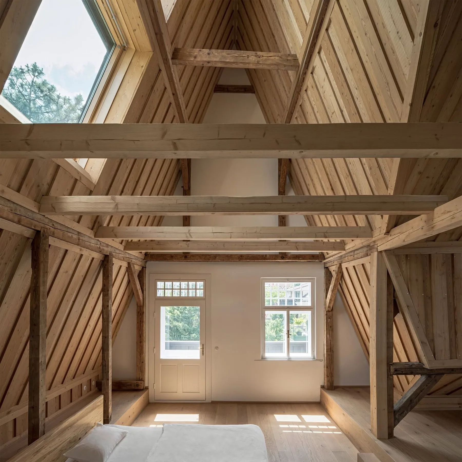 The extension to Villa Sternberg was conceived as a lightweight timber structure that would contrast with the solidity of the main building while remaining visually calm within the landscape. Large glazed openings were central to this concept, allowing the interior spaces to open fully toward the surrounding terrain. The key challenge was accommodating sliding doors in a timber framed extension without compromising the clarity of the architecture. The timber structure imposed tight tolerances, and the glazing needed to sit flush with both internal and external finishes. Visual consistency, structural coordination, and long‑term movement within the timber frame all required careful consideration.
